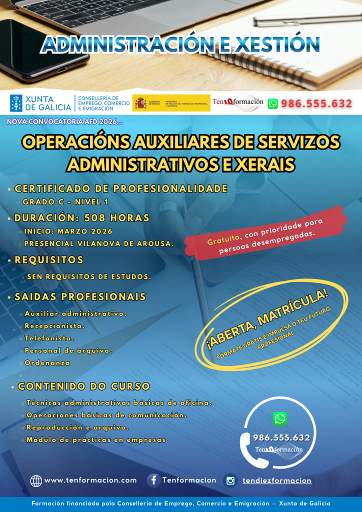 ๐ Queres traballar no รกmbito da administraciรณn? Este curso รฉ a tรบa oportunidade para iniciarte no sector e desenvolver habilidades crave moi demandadas en oficinas, empresas e administraciรณns pรบblicas.
