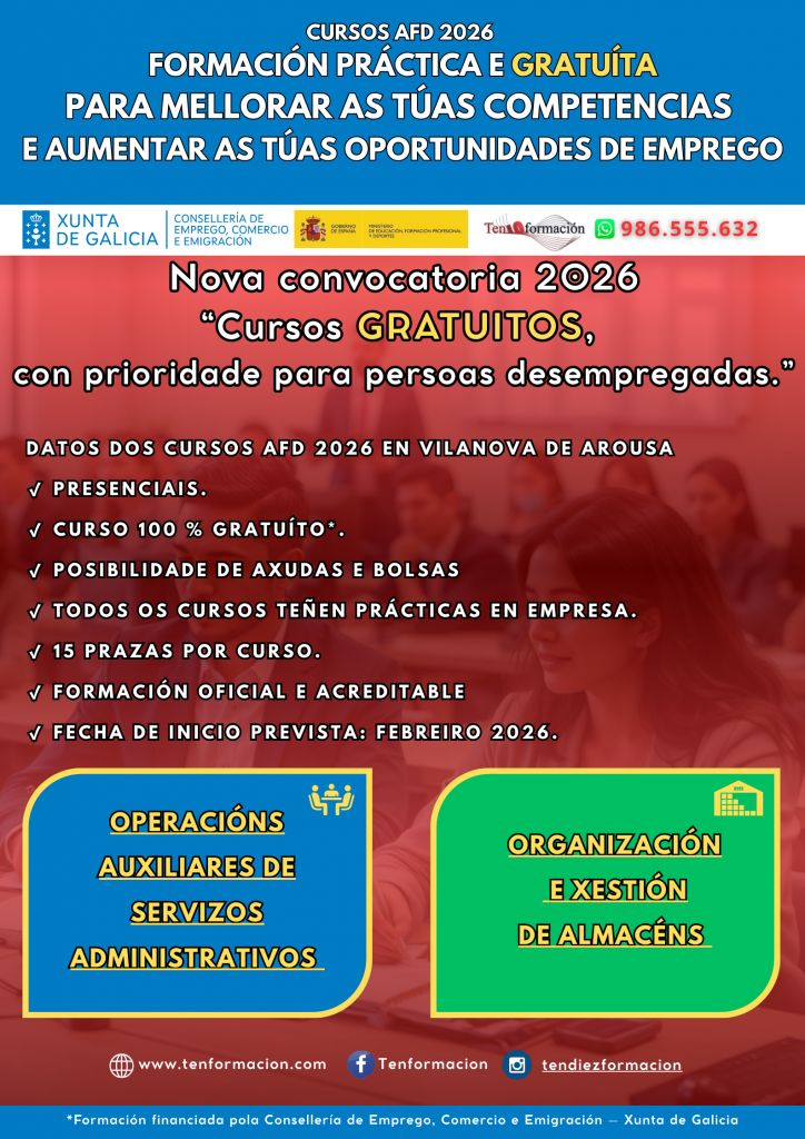 #FormaciónGratuita #OportunidadLaboral #AFDGalicia #TenDiezFormación #VilanovadeArousa #CreceProfesionalmente